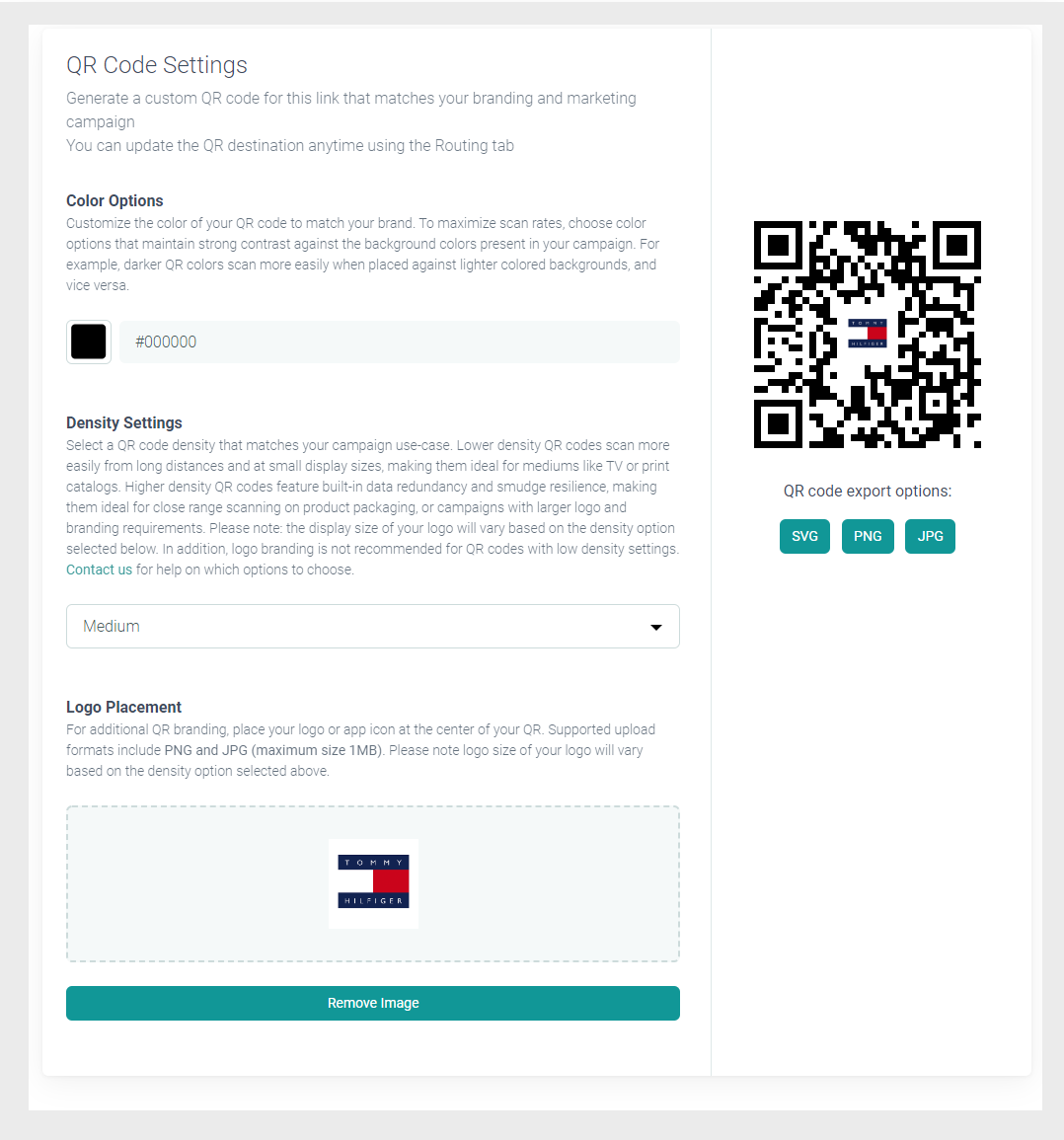 The 'QR Settings' tab presents you with different options to customize your code, but beware— changing these settings can impact the ability of your user to scan the code. Contact us if you have questions about these settings, or if you're working on a unique use case that requires expert guidance.